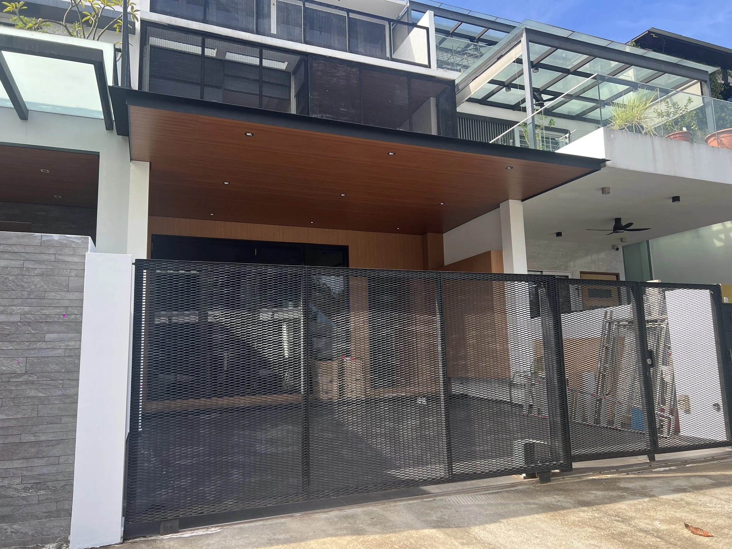 Before (left): The car porch featured a dark ceiling and a simple black gate that made the overall frontage look heavier and more enclosed.